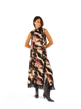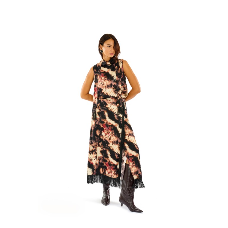 Gonna midi fluida realizzata in raso di viscosa stampato effetto acquerello , arricchita da frange nere sul fondo e lungo lo spacco. Linea dritta con vita alta, per look boho chic o eleganti da sera. Un capo sofisticato che valorizza la silhouette.