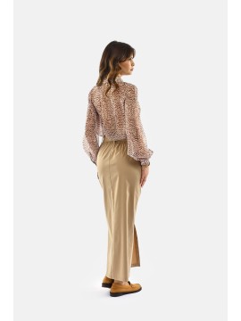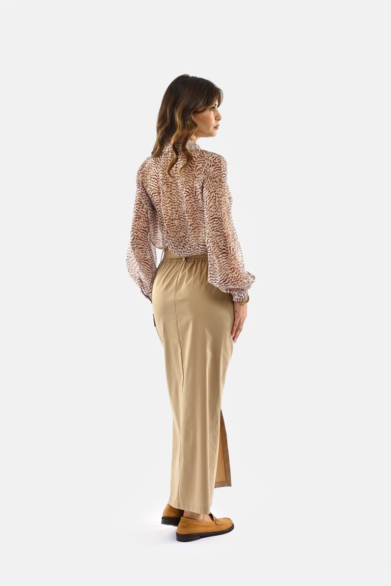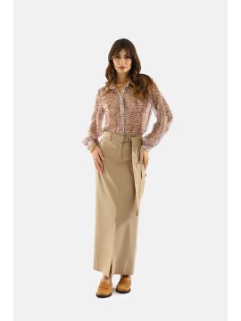 Gonna midi in cotone, caratterizzata da vita alta con cintura abbinata e fibbie in metallo dorato. Il design è arricchito da una tasca laterale con pattina e da una spacchettatura frontale, che dona comfort e movimento. Una proposta dal fascino utility-chic, ideale per outfit raffinati e contemporanei.