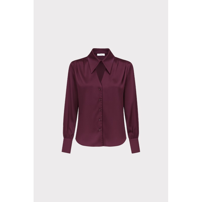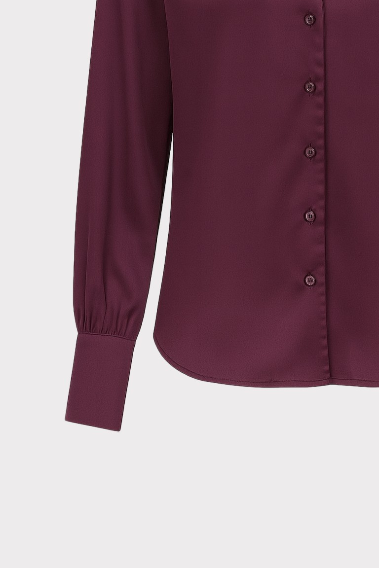 Camicia elegante in raso satin, Il colletto classico e le maniche lunghe disegnano una silhouette raffinata, adatta tanto a un meeting di lavoro quanto a una cena elegante. Tessuto lucido per un look femminile e raffinato. È il capo che parla di femminilità decisa