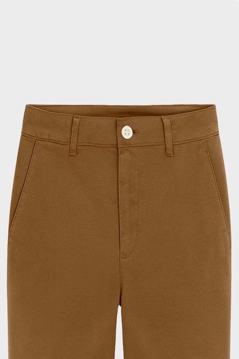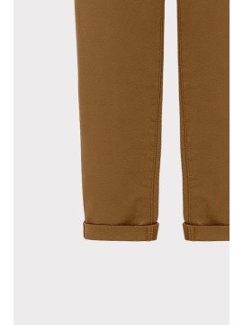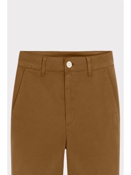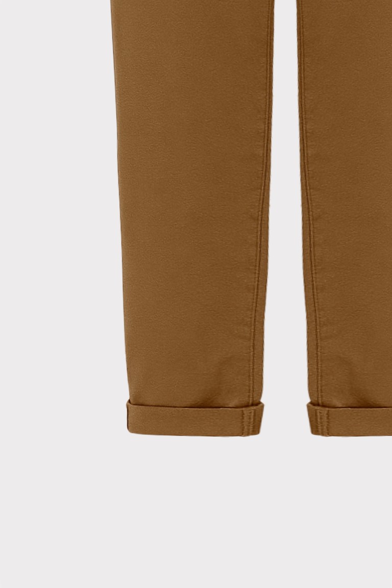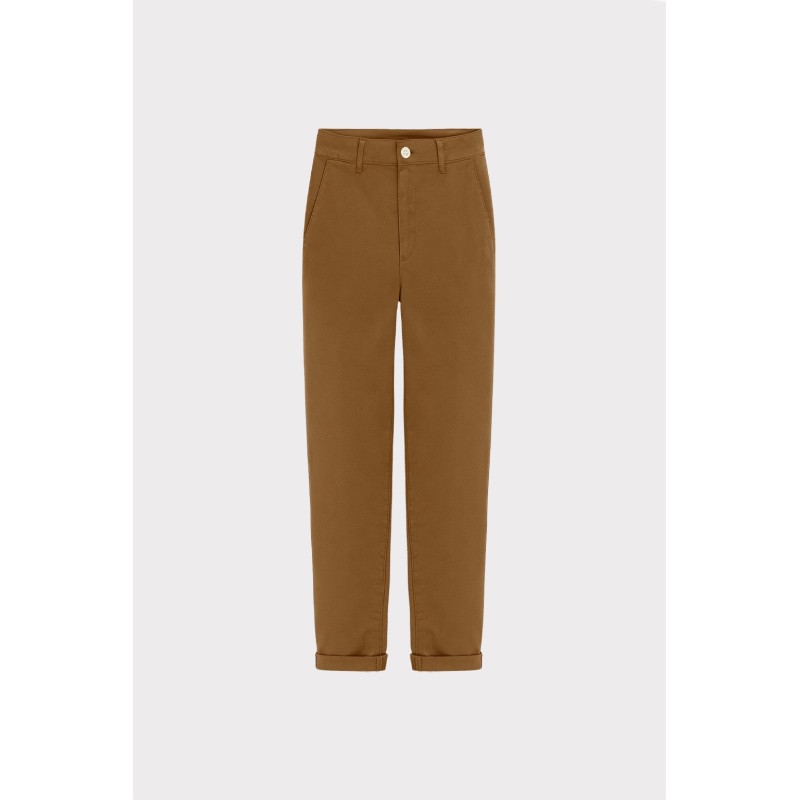 Pantalone chino da donna dal taglio dritto e fit regolare. Dotato di tasche alla francese frontali, vita media con passanti e chiusura con bottone e zip. L’orlo risvoltato aggiunge un tocco moderno e curato, perfetto per outfit casual e smart. Un capo essenziale e versatile per ogni guardaroba.