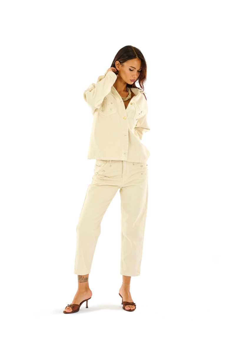 Giacca in denim con vestibilità morbida. Caratterizzata da tasche applicate sul petto arricchite da strass e perle decorative. Colletto classico, chiusura frontale con bottoni metallici e polsini con bottone. Perfetta da abbinare al jeans coordinato per un total look luminoso e contemporaneo.
