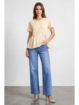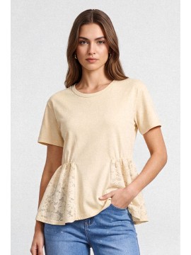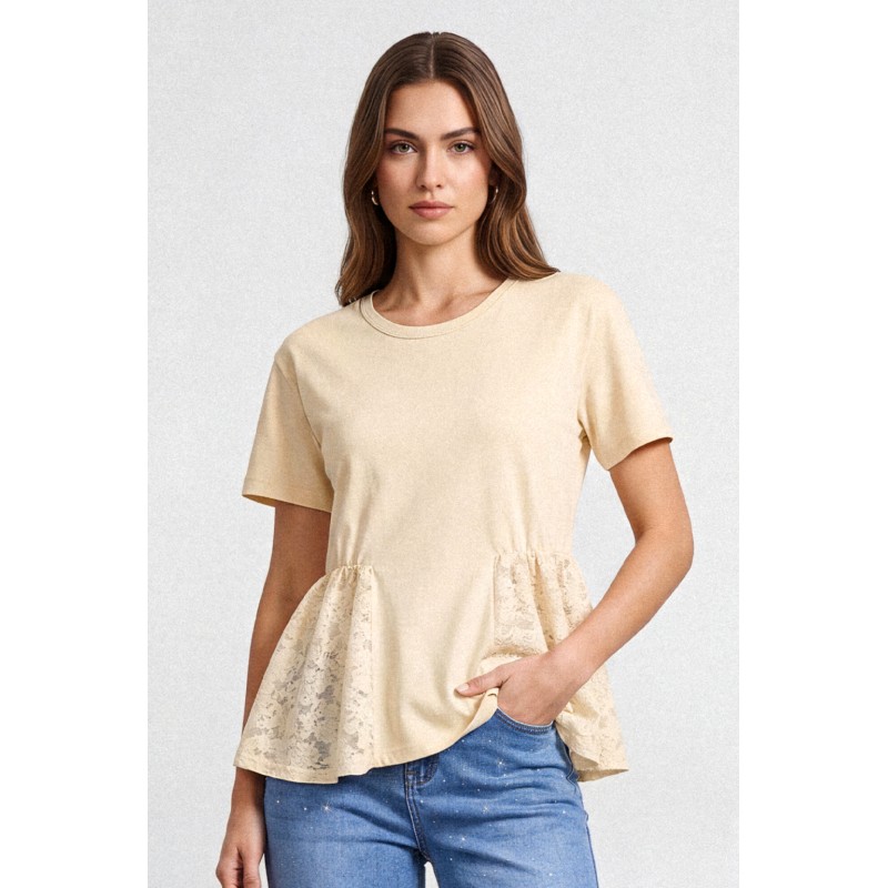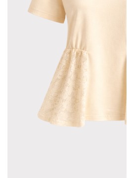 T-Shirt dal design femminile e contemporaneo realizzata in tessuto morbido e leggero, caratterizzata da raffinati inserti in pizzo e macrame' applicati sui lati che donano movimento e un effetto decorativo delicato. La combinazione tra il corpo essenziale della shirt e le lavorazioni traforate crea un equilibrio elegante tra semplicità e ricercatezza. Il modello presenta scollo rotondo e maniche corte, con una vestibilità morbida e confortevole che valorizza la silhouette. Gli inserti laterali in pizzo e uncinetto aggiungono profondità e leggerezza al capo, rendendolo ideale per outfit casual chic o abbinamenti più raffinati.