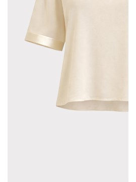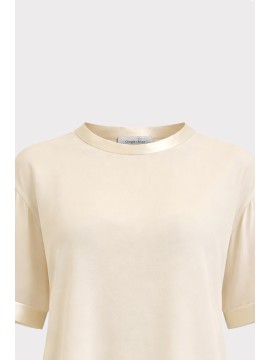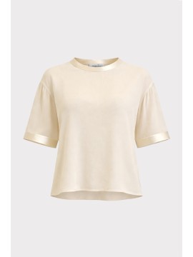 T-shirt in georgette leggera e fluida, reinterpretazione contemporanea del basic estivo. La linea ampia con maniche morbide e spalla scesa dona un fit rilassato e sofisticato, pensato per accompagnare il movimento con naturale eleganza. Il tessuto leggermente trasparente e impalpabile conferisce al capo un aspetto arioso e raffinato, mentre gli inserti in raso tono su tono su fondo e maniche la rendono un capo ricercato. Versatile e facile da abbinare, è perfetta per look quotidiani curati, da indossare con pantaloni sartoriali o denim per uno stile minimal chic.
