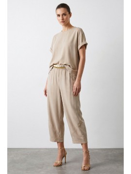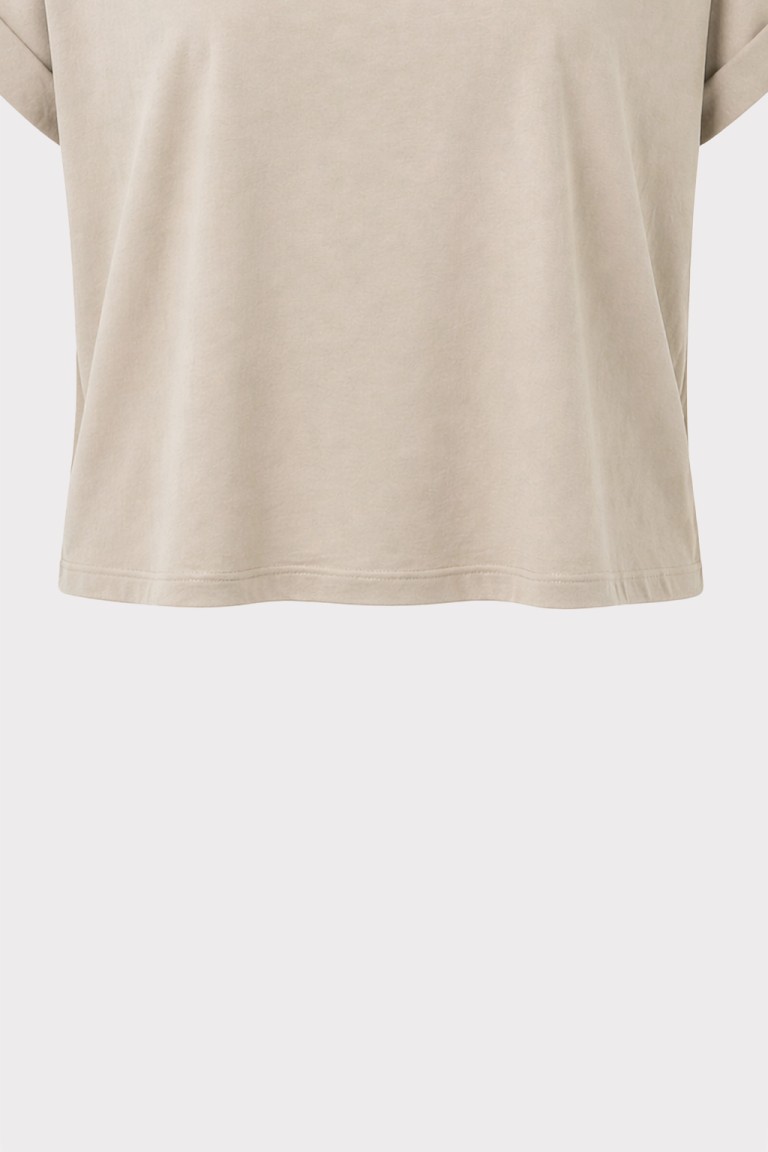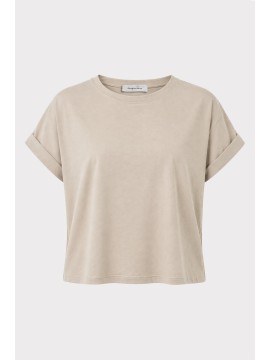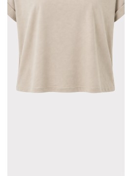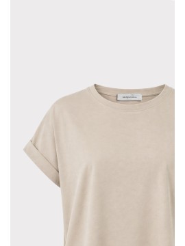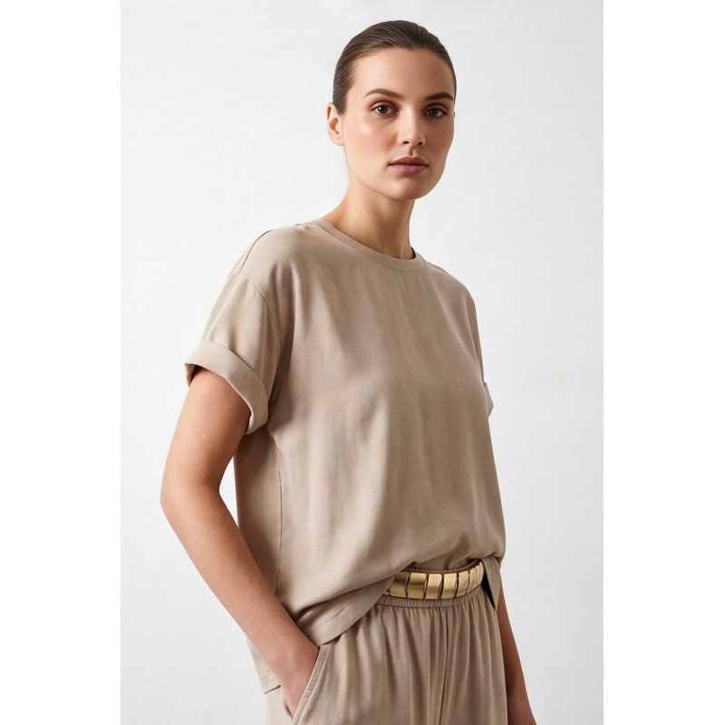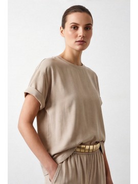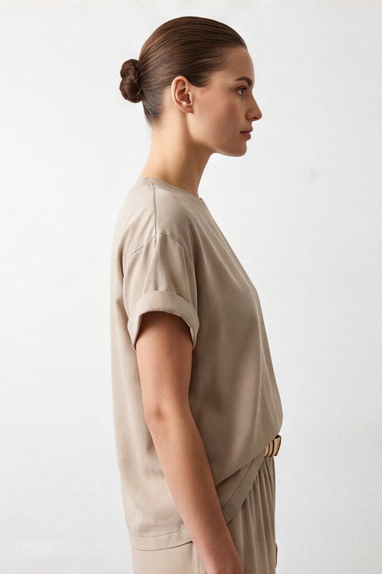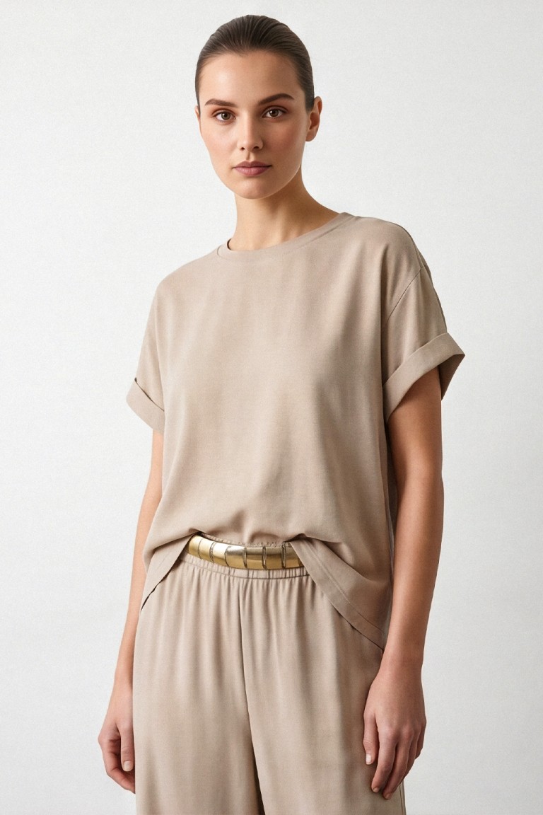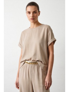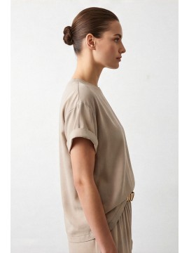 T-shirt dal design essenziale e contemporaneo, realizzata in tessuto cupro, una fibra pregiata dall’effetto setoso e dalla straordinaria morbidezza. Il modello presenta un girocollo pulito e maniche corte con linea leggermente morbida, pensata per offrire comfort e libertà di movimento. La vestibilità fluida accompagna il corpo con naturalezza, creando un look rilassato ma curato.Un capo essenziale e raffinato, perfetto per una donna dinamica che ricerca comfort, qualità e stile pulito.