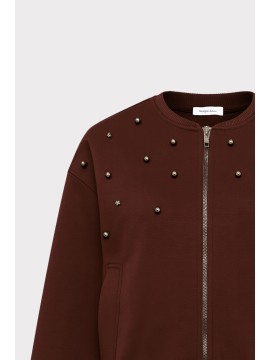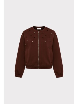 Felpa modello over con zip frontale, scollo tondo e fondo elasticizzato. Realizzata in modal, decorata con applicazioni gioiello per un tocco femminile e contemporaneo.