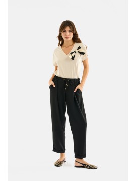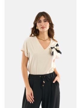 T-shirt con scollo a V e maniche ad aletta, impreziosita da un fiocco decorativo con code applicato sul punto spalla. La linea morbida e il fondo con piccoli spacchi laterali donano comfort e femminilità, perfetta per look eleganti ma disinvolti.