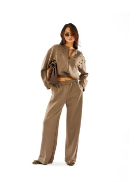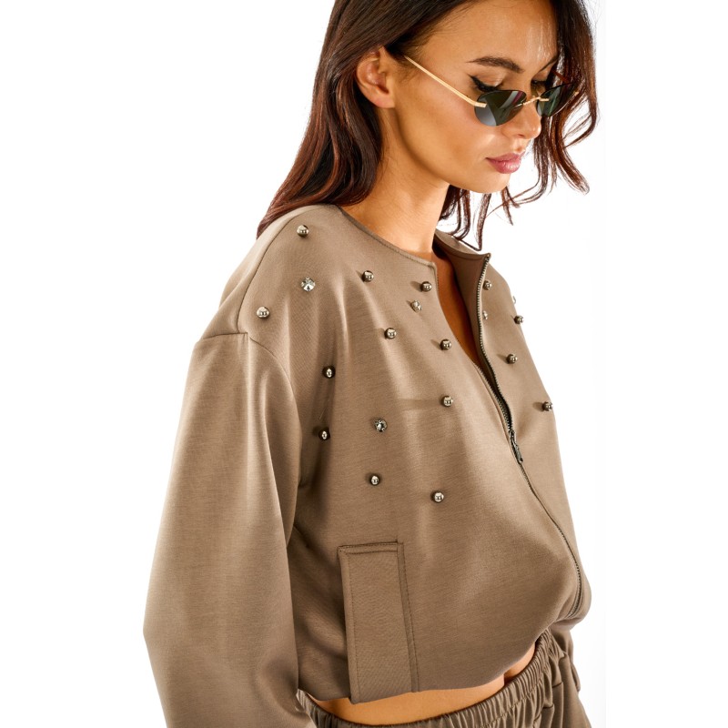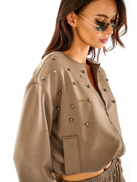 Felpa modello over con zip frontale, scollo tondo e fondo elasticizzato. Realizzata in modal, decorata con applicazioni gioiello per un tocco femminile e contemporaneo.