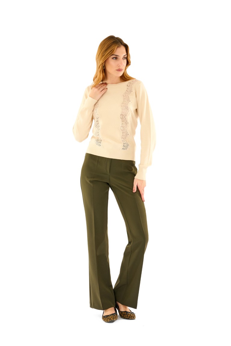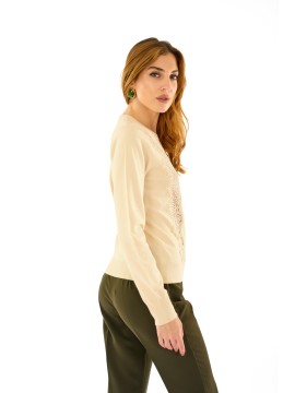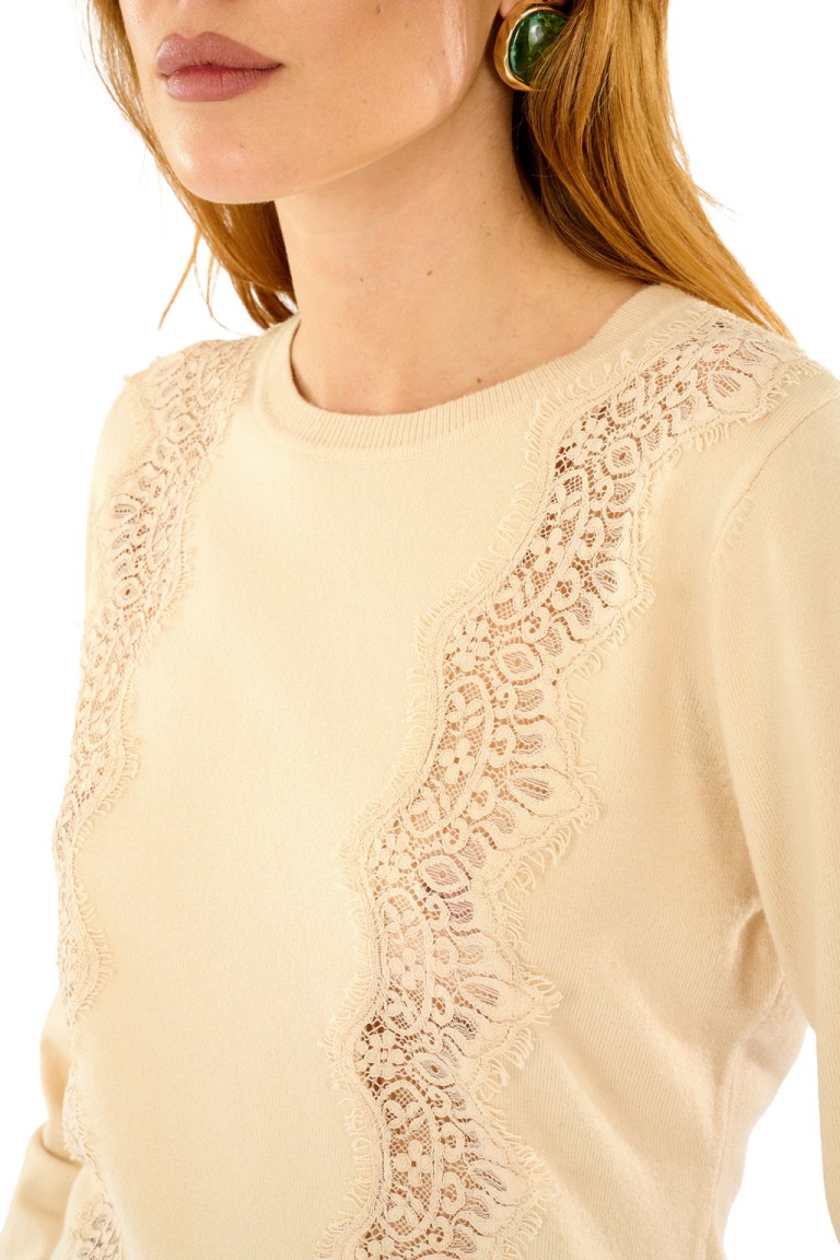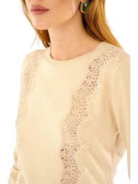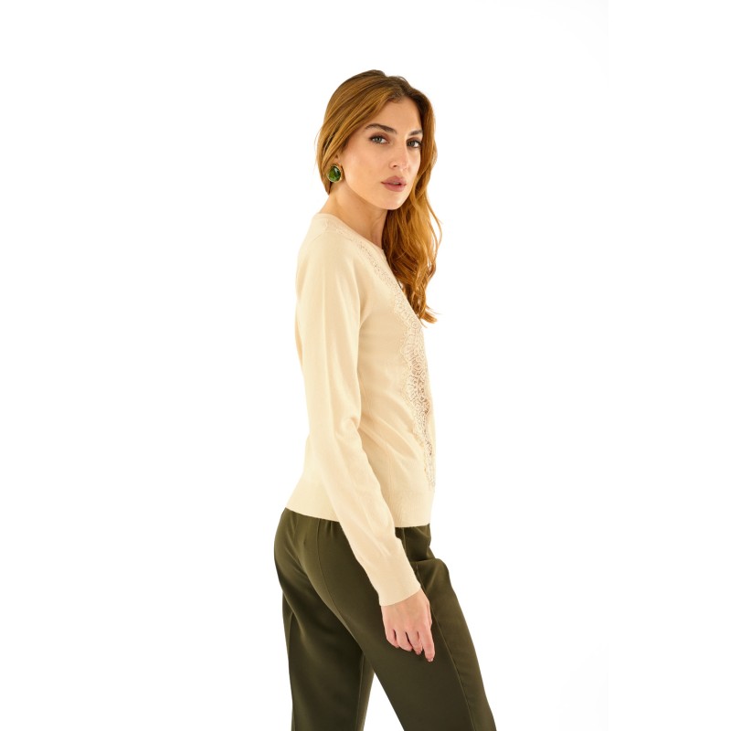 Maglia a manica lunga , impreziosita da eleganti inserti in pizzo ricamato sul davanti. Un capo femminile e sofisticato, perfetto per look da ufficio o serate chic. Ideale per uno stile romantico e raffinato.