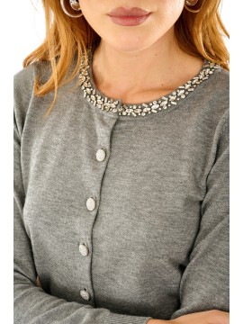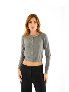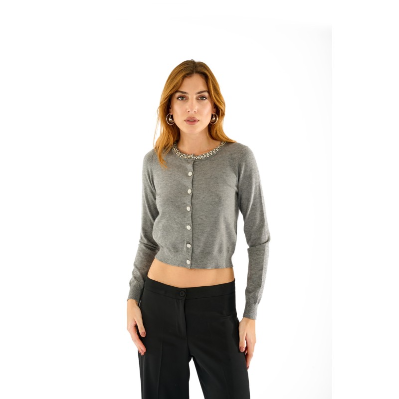 Cardigan che dona un tocco raffinato ai tuoi look . Realizzato in morbido filato misto viscosa, si distingue per i bottoni gioiello e il colletto impreziosito da strass e applicazioni brillanti. Perfetto da indossare aperto o chiuso, è ideale per look da giorno chic o per serate eleganti. Un capo must-have per la donna che ama i dettagli sofisticati.