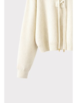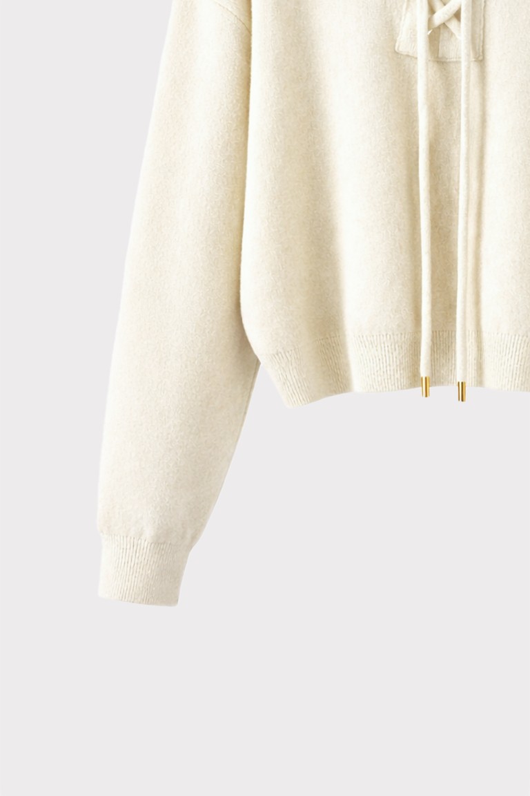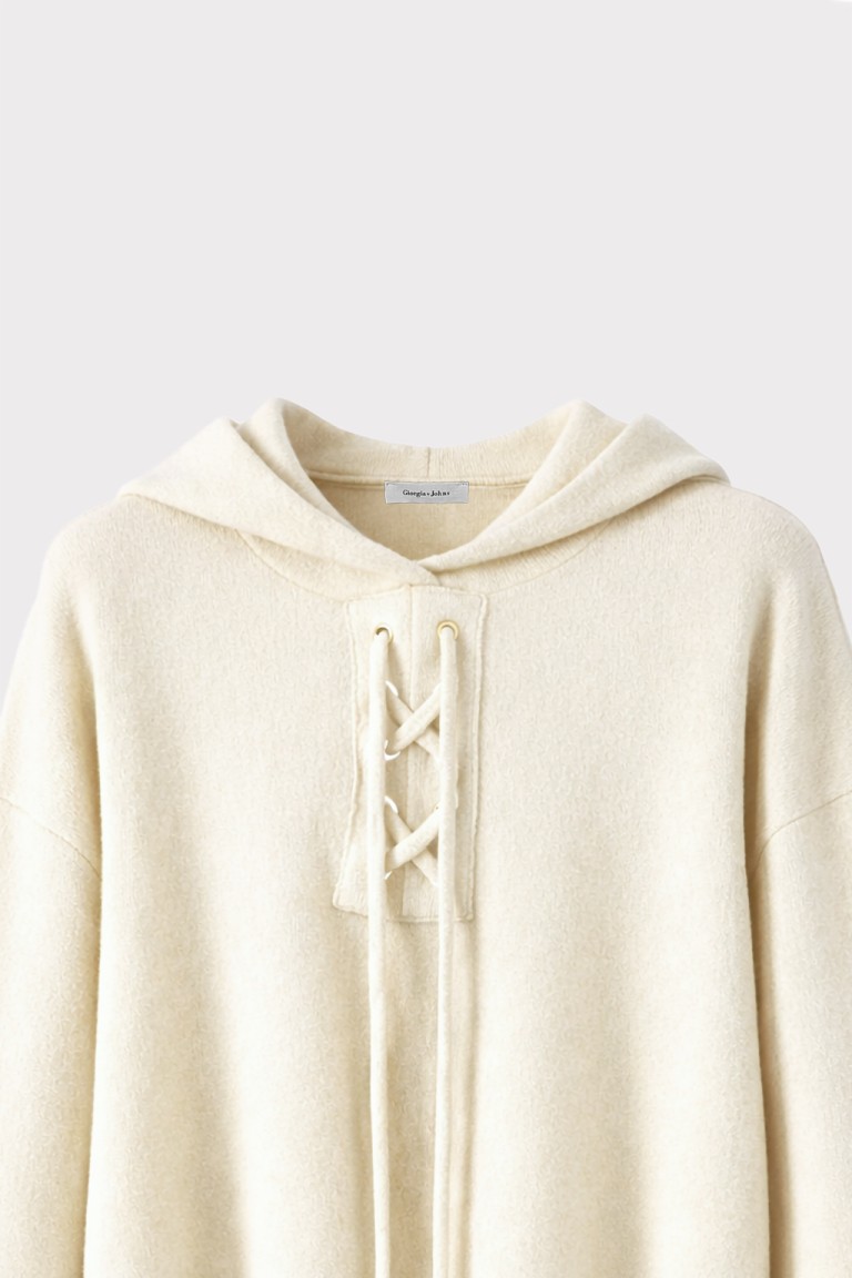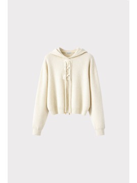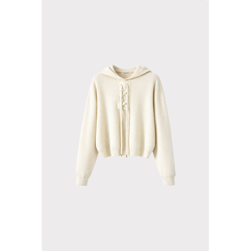 Maglia con cappuccio dal design contemporaneo, arricchita da dettaglio frontale con allacciatura decorativa. Un capo versatile che unisce lo stile casual al comfort del knitwear, perfetto per look urbani e rilassati ma curati.