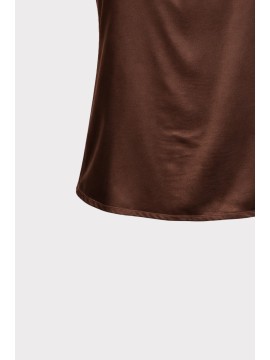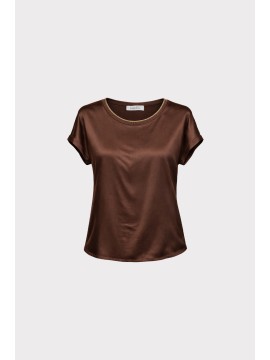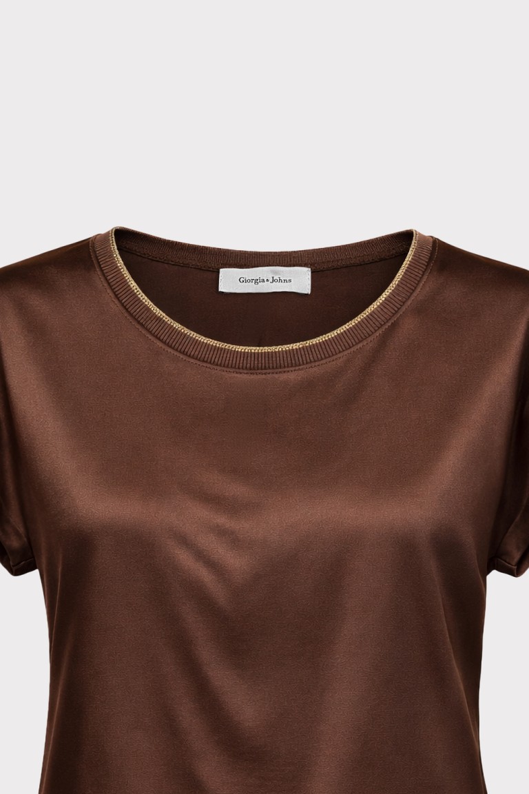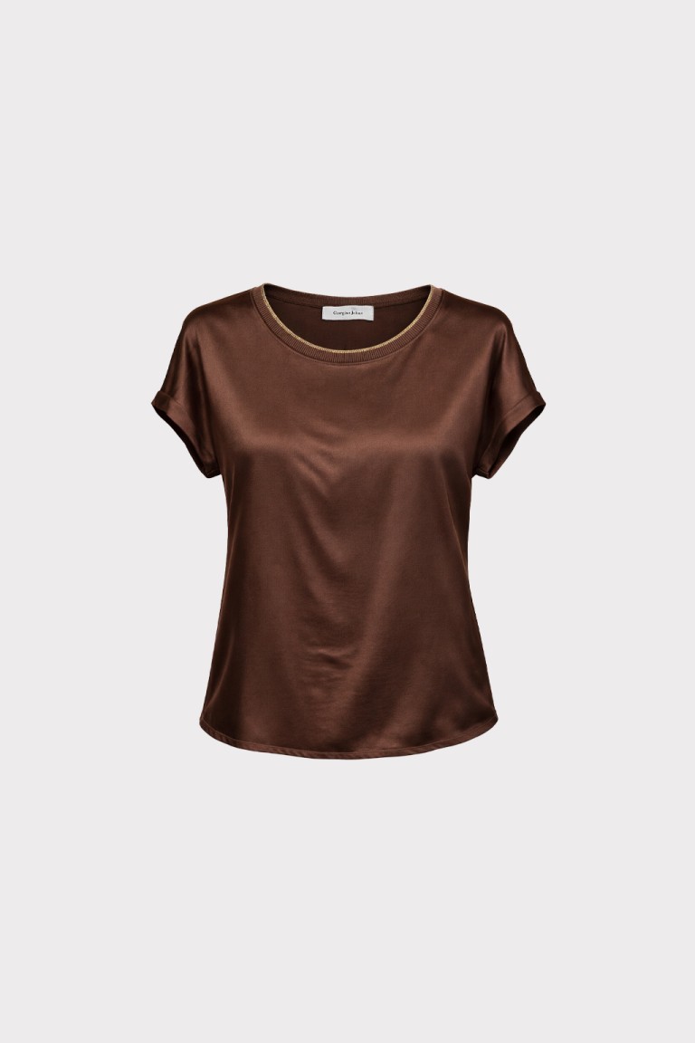 T-shirt in tessuto fluido effetto raso, con linea morbida e leggera. Il modello presenta scollatura rotonda rifinita con bordo in costina, maniche corte ad aletta e orlo stondato leggermente più lungo sul retro, per una vestibilità confortevole e femminile. Un capo essenziale e versatile, perfetto per look casual chic o per completare coordinati eleganti.