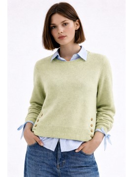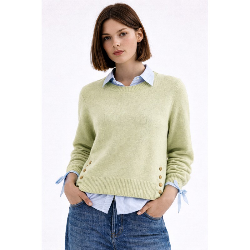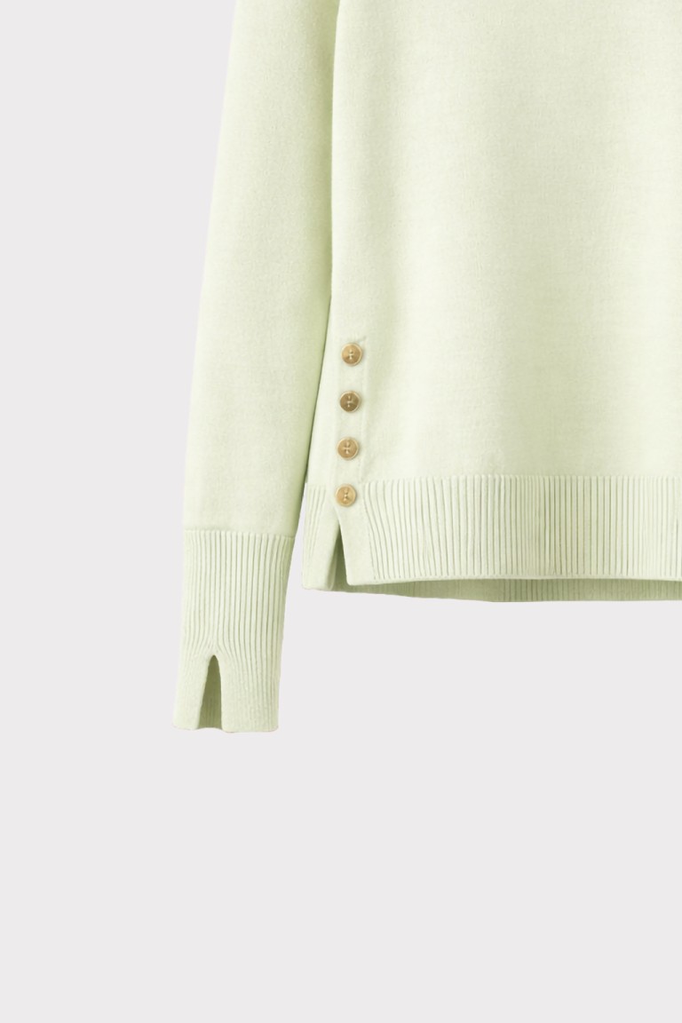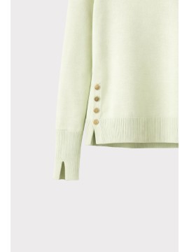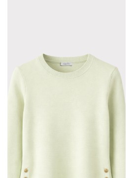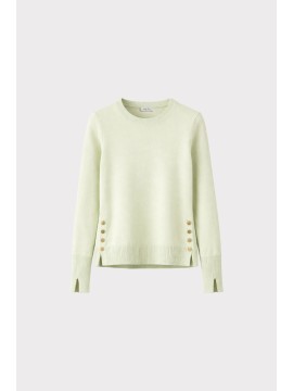 Maglia girocollo basic con maniche lunghe. Dettaglio laterale di spacco e bottoni metallici oro light. La modella è alta 1,75 cm ed indossa una taglia S.