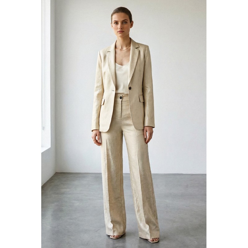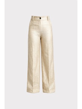 Pantalone palazzo realizzato in tessuto mosso effetto lucido, caratterizzato da una texture materica e raffinata che dona profondità al capo e valorizza la silhouette con eleganza contemporanea. Il tessuto fluido e leggermente luminoso conferisce un aspetto sofisticato mantenendo al tempo stesso una vestibilità confortevole. Il modello presenta vita regolare con passanti e chiusura con bottone, mentre la linea ampia e scivolata della gamba crea un movimento naturale che slancia la figura. Il design essenziale è arricchito da pince frontali, dettaglio sartoriale che migliora la vestibilità e aggiunge struttura al pantalone.