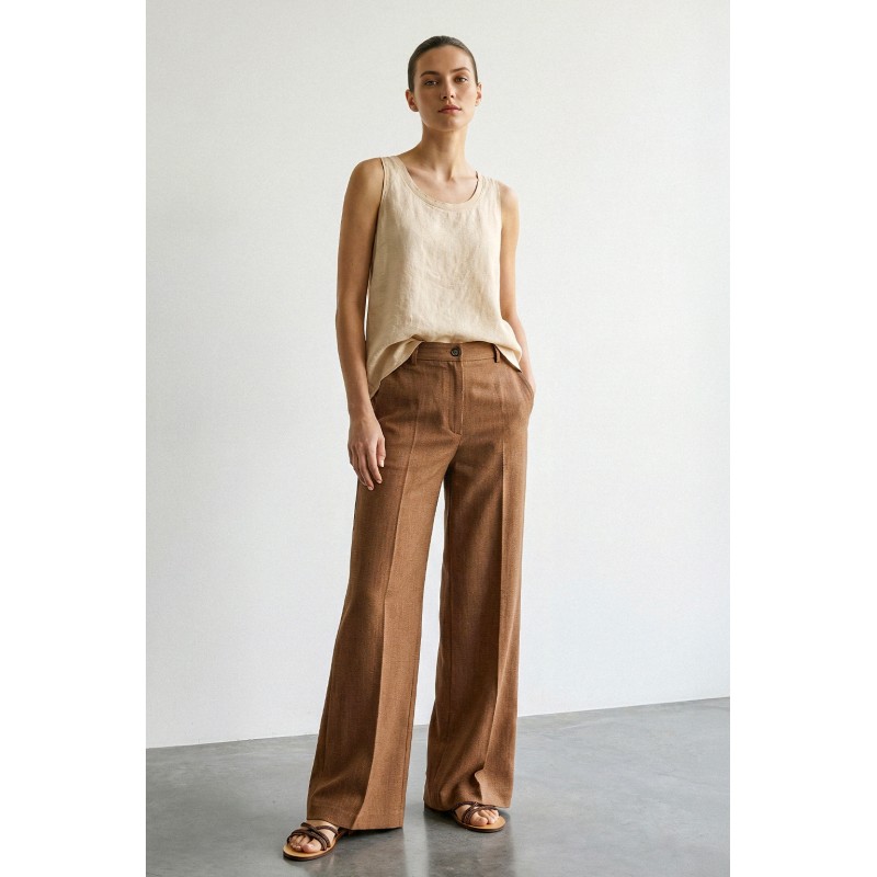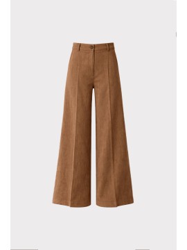 Il pantalone palazzo in lyocell effetto denim è il capo ideale per un look sofisticato ma naturale. Realizzato in lyocell leggero e fluido, offre una vestibilità morbida e confortevole, perfetta per accompagnare i movimenti con una caduta impeccabile. Il tessuto con texture effetto denim dona profondità alla superficie e un carattere contemporaneo, mantenendo allo stesso tempo la morbidezza tipica del lyocell. Il taglio palazzo slancia la figura e crea una linea elegante e moderna, adatta sia a look casual chic che a outfit più raffinati. La vita regolare con passanti e chiusura con bottone completa il design pulito e minimale.