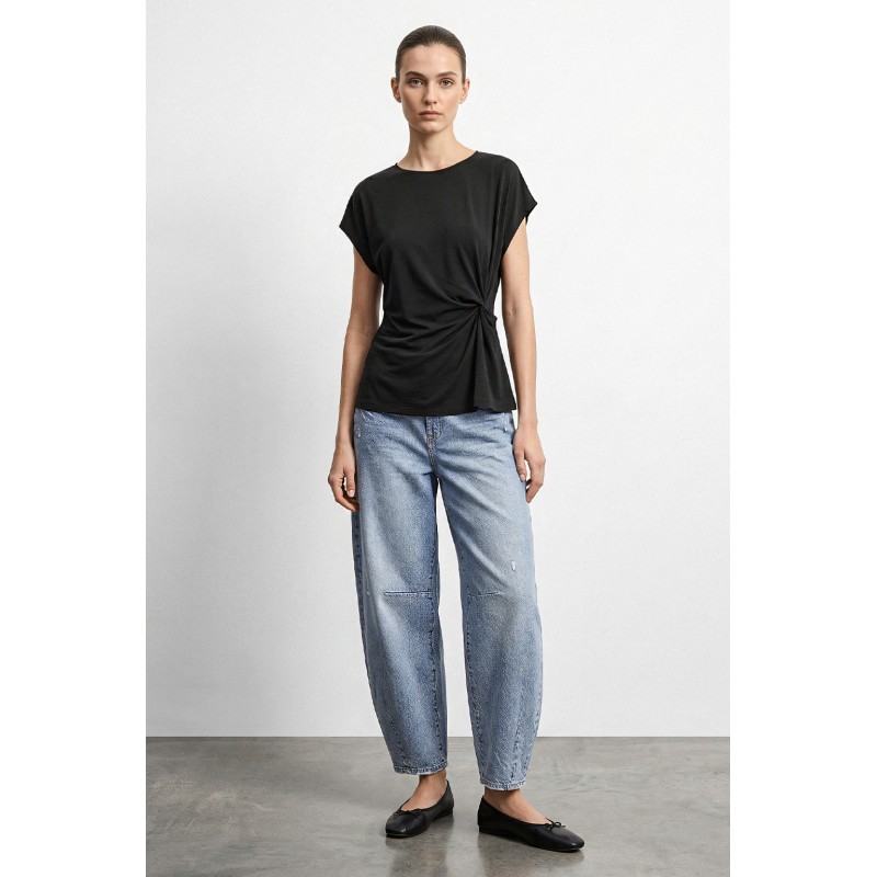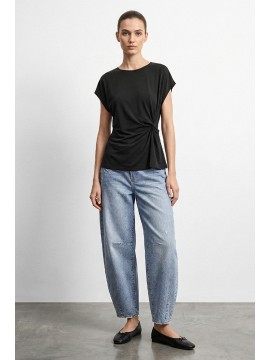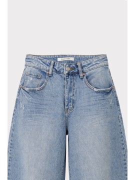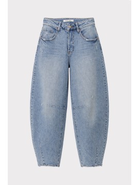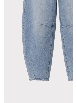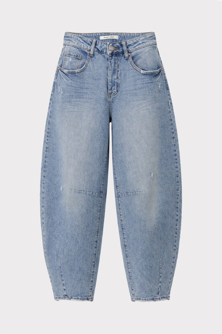Jeans dal design contemporaneo con linea balloon, caratterizzati da volumi morbidi e arrotondati che si stringono leggermente al fondo, creando una silhouette moderna e distintiva. Realizzati in denim lavaggio chiaro con effetto leggermente used, presentano dettagli di taglio e impunture che valorizzano la struttura del capo e ne esaltano l’attitudine fashion. La vestibilità confortevole li rende ideali per un uso quotidiano senza rinunciare allo stile