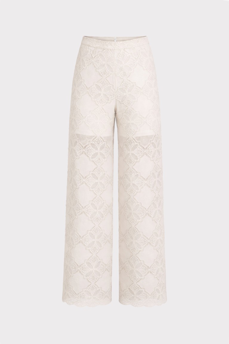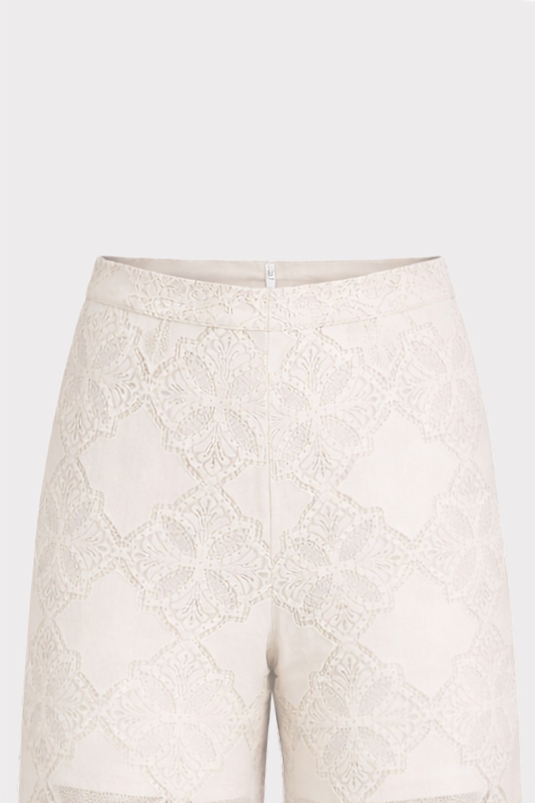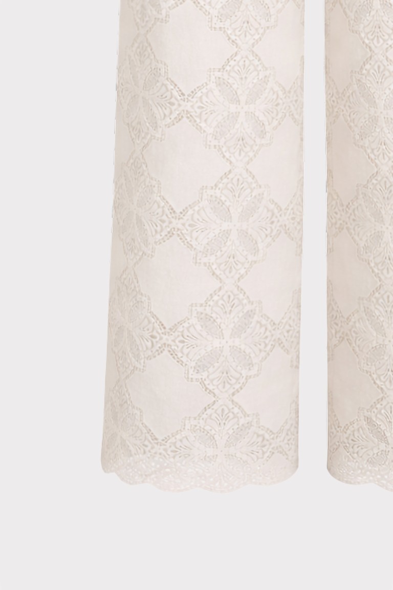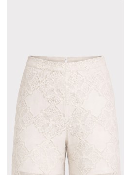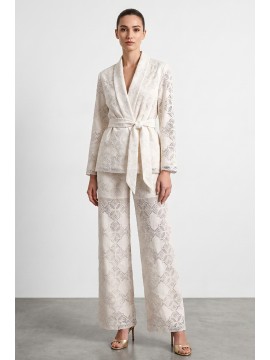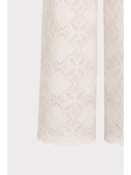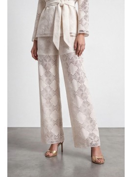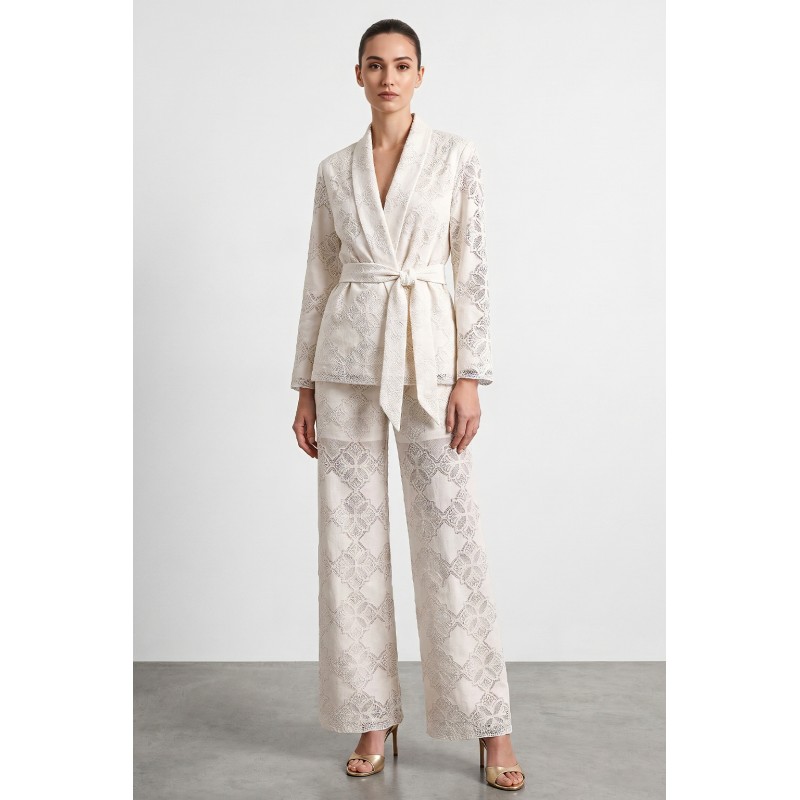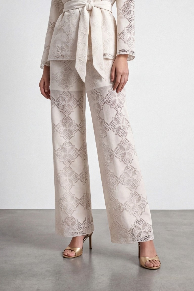 Pantalone in tessuto macramè con motivo geometrico, caratterizzato da una lavorazione decorativa che dona texture e raffinatezza al capo. Il disegno all-over crea un effetto elegante e sofisticato, perfetto per outfit estivi ricercati. La linea morbida e fluida assicura comfort e libertà di movimento, mentre il design pulito valorizza la lavorazione del tessuto. Pensato per essere abbinato alla giacca coordinata in macramè, permette di creare un completo elegante e contemporaneo. Un capo distintivo che unisce femminilità, leggerezza e stile.
