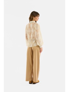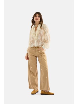 Pantalone modello palazzo realizzato in cotone stretch, dalla linea ampia e fluida che valorizza la silhouette. Il dettaglio di perle applicate sul davanti illumina il design con un’eleganza discreta e contemporanea. Vita regolare con passanti, tasche alla francese e chiusura con bottone e zip invisibile.