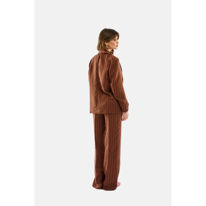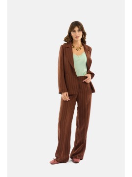 Il pantalone è realizzato in tessuto Tencel a righe tono su tono, morbido e sostenibile, perfetto per chi cerca comfort e stile contemporaneo.Il modello slancia la silhouette e dona un’allure sofisticata, mentre la vita sagomata con chiusura frontale assicura una vestibilità impeccabile. Ideale sia con blazer coordinato sia con top minimal per un look più fresco.