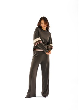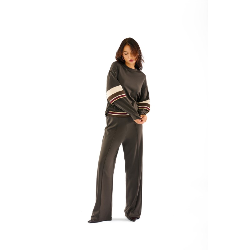 Pantalone ampio in punto Milano, elegante e confortevole. Vita alta con dettaglio in costina elasticizzata per una vestibilità perfetta. Gamba larga con cucitura centrale per un effetto slanciante. Ideale per look casual chic o da ufficio