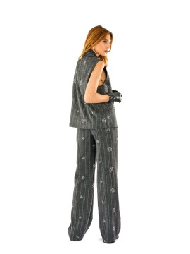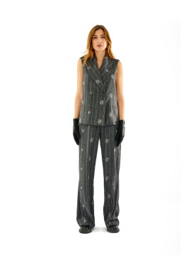 Pantalone gessato con ricami floreali all-over è la scelta ideale per un look sofisticato. Linea dritta, vita alta con passanti e tasche laterali. Da abbinare al gilet coordinato o a camicie leggere per outfit urban chic.