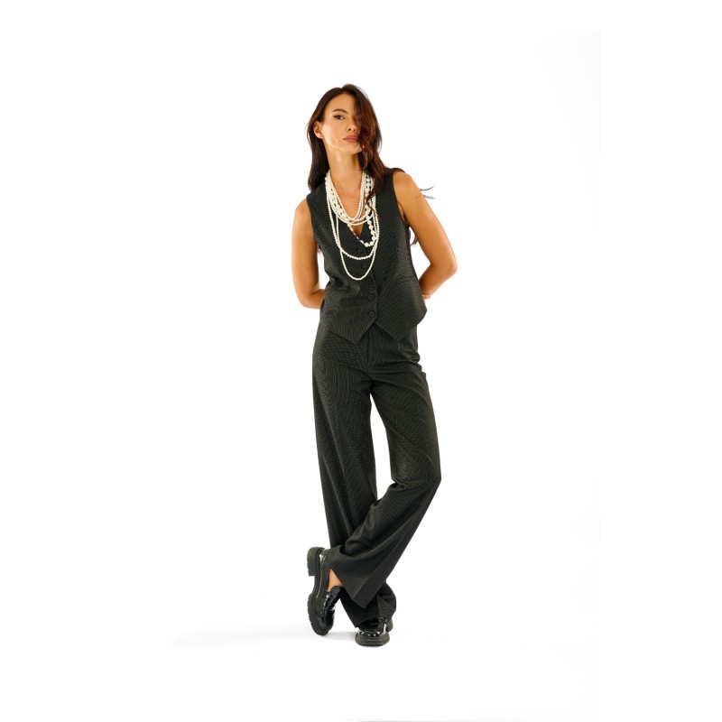 Eleganza e versatilità in un capo intramontabile. Realizzato in tessuto gessato, questo pantalone a gamba dritta slancia la figura ed è perfetto per look da ufficio o outfit serali. Vita regolare, chiusura con zip e bottone, tasche laterali e posteriori a filetto. Un essenziale dal taglio sartoriale che non può mancare nel guardaroba.