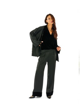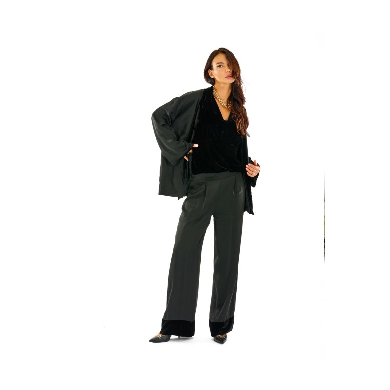 Pantaloni neri a gamba ampia con bordo in velluto lucido sul fondo. Dal taglio palazzo e vita comoda, aggiungono un tocco chic a qualsiasi outfit da sera o occasione formale. Perfetti con top eleganti o bluse morbide