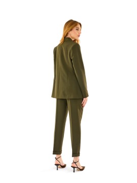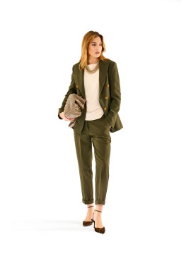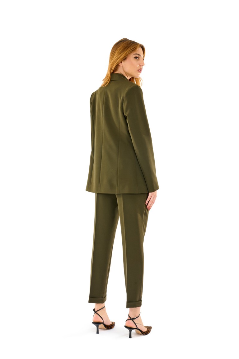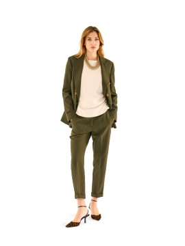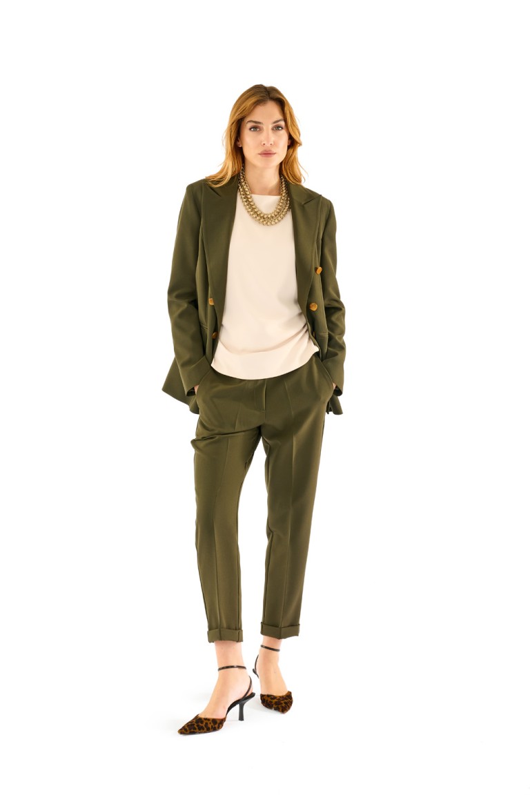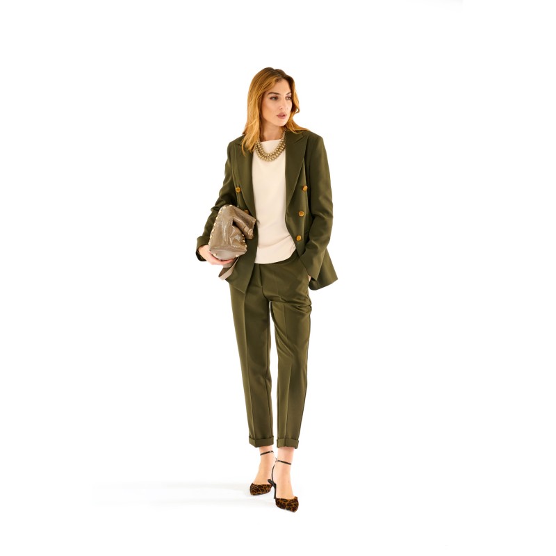 Pantalone donna elegante a vita alta con gamba dritta e piega stirata al fondo per un tocco sartoriale. Realizzato in tessuto strutturato, è perfetto da abbinare alla giacca coordinata. Chiusura con zip e bottone. Ideale per look formali, da ufficio o eventi eleganti.