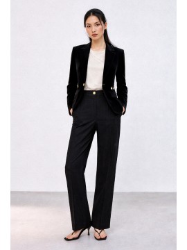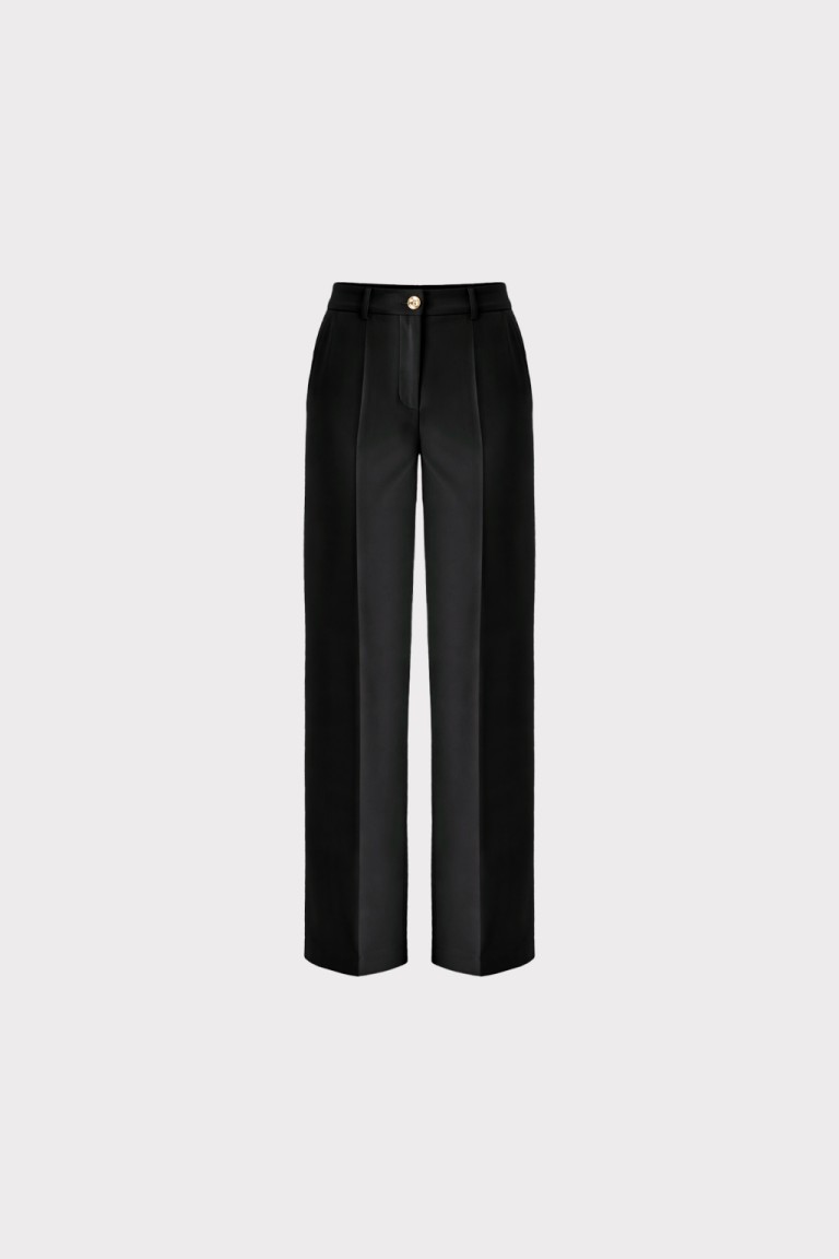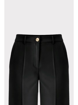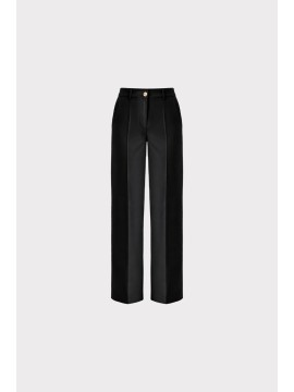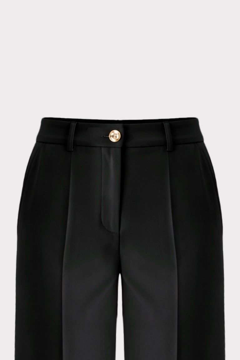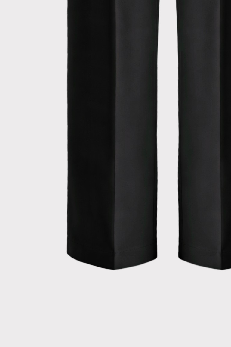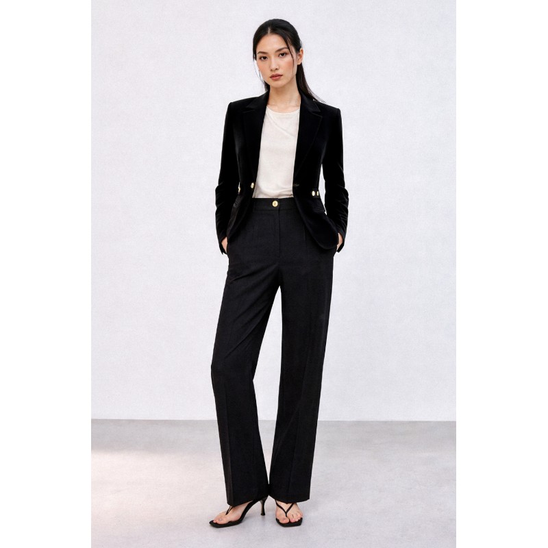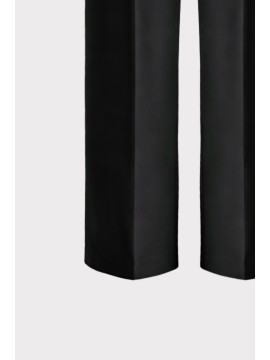 Pantalone palazzo in tessuto tecnico, caratterizzato da una linea elegante e pulita. La vita alta sagomata valorizza la figura, mentre le tasche uomo con travette alle estremità sottolineano la cura dei dettagli sartoriali. Chiusura con bottoncino metallico che aggiunge una nota luminosa e contemporanea. Perfetto in coordinato con la giacca per un total look dal fascino sofisticato
