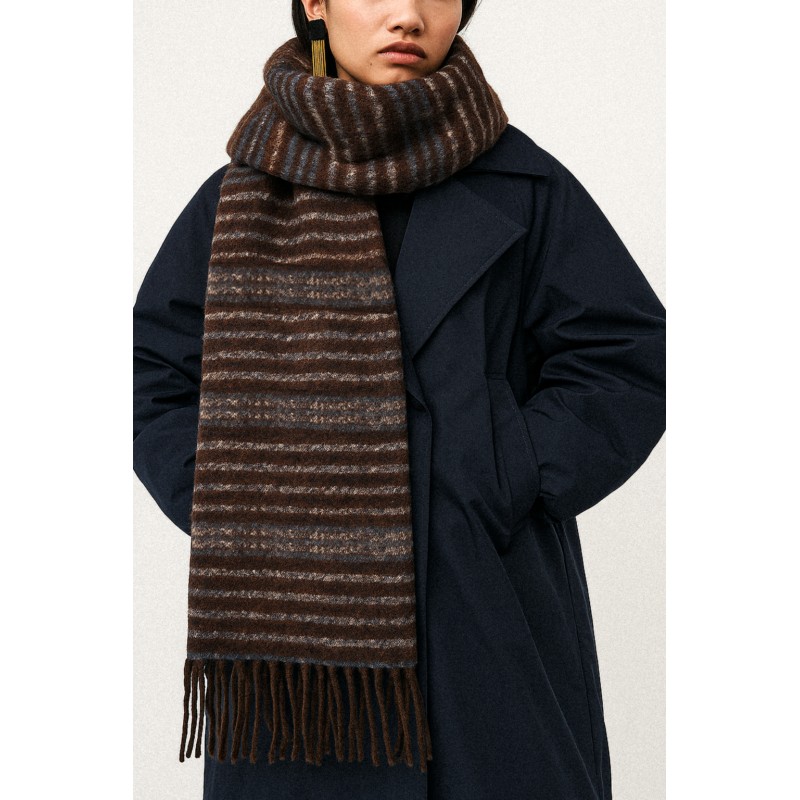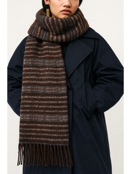 Sciarpone in morbido tessuto con fantasia a righe. Rifinito con frange sul fondo, è l'accessorio ideale per affrontare le giornate fredde con stile e comfort. cm 63X178