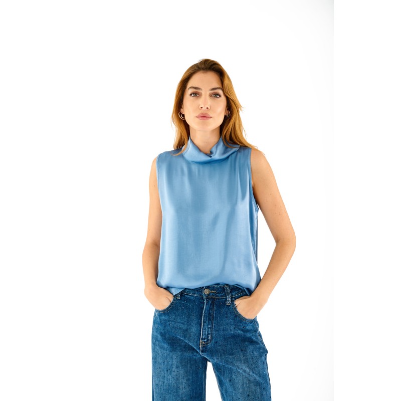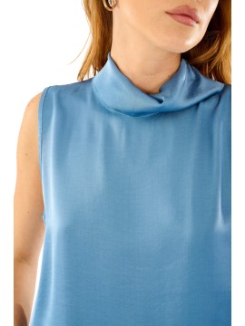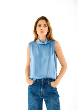 Top smanicato con collo morbido drappeggiato. Realizzato in raso di viscosa, dalla vestibilità comoda e sofisticata. Perfetto per un look da sera o come elemento di contrasto in outfit monocromatici neutri