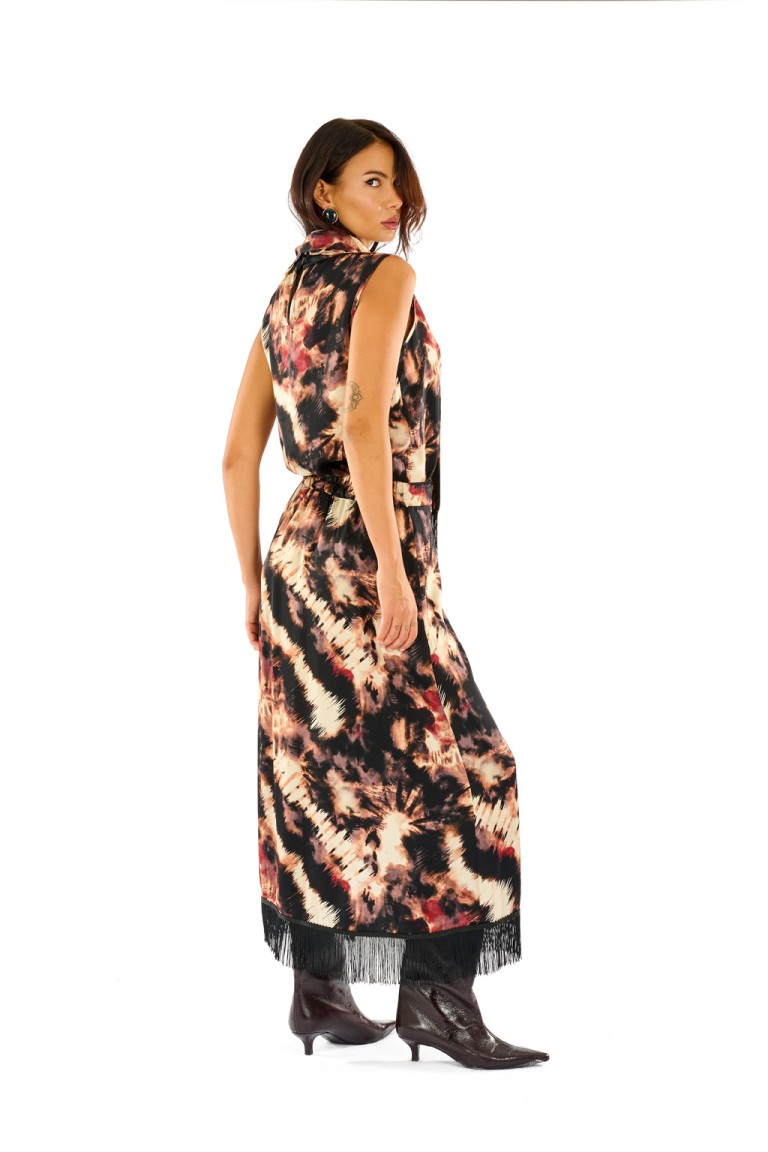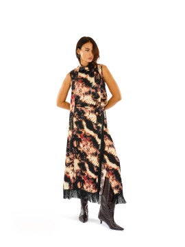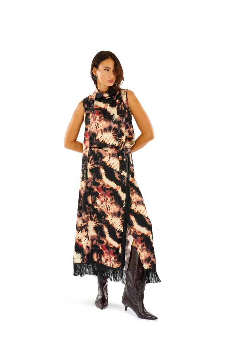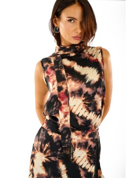 Top senza maniche con collo foulard realizzato in raso di viscosa stampato. Il dettaglio del laccio con frange nere aggiunge movimento ed eleganza. Perfetto con gonne lunghe o pantaloni a palazzo per outfit sofisticati