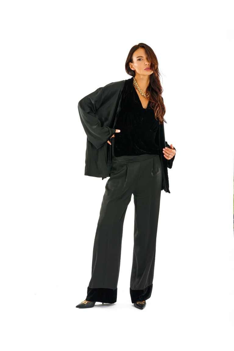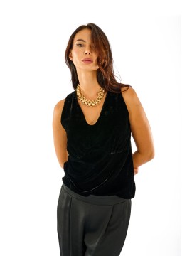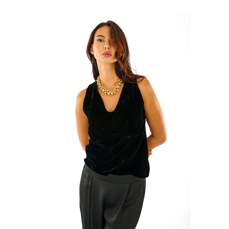 Top smanicato da donna in velluto e tulle con profondo scollo a V. Morbido e avvolgente, perfetto da indossare con pantaloni palazzo o gonne a vita alta per outfit eleganti e ricercati.