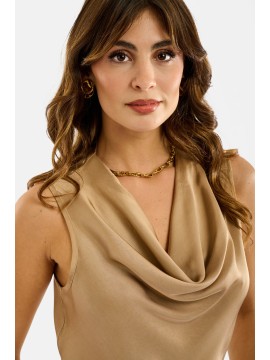 Top in raso con scollo drappeggiato, perfetto per un look raffinato e femminile. Il modello senza maniche valorizza la linea delle spalle, mentre il morbido tessuto satinato dona una lucentezza delicata e un tocco di classe. Dettaglio posteriore con piccola apertura e chiusura a bottone per un effetto sofisticato e confortevole. Ideale da abbinare a pantaloni palazzo o gonne midi per outfit da giorno o da sera. Un capo essenziale, versatile e di tendenza, realizzato con cura artigianale in Italia.