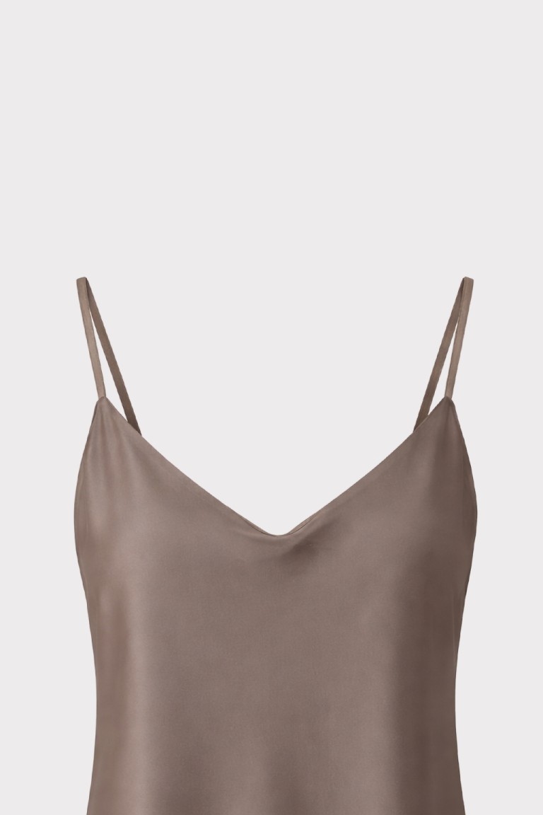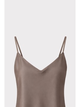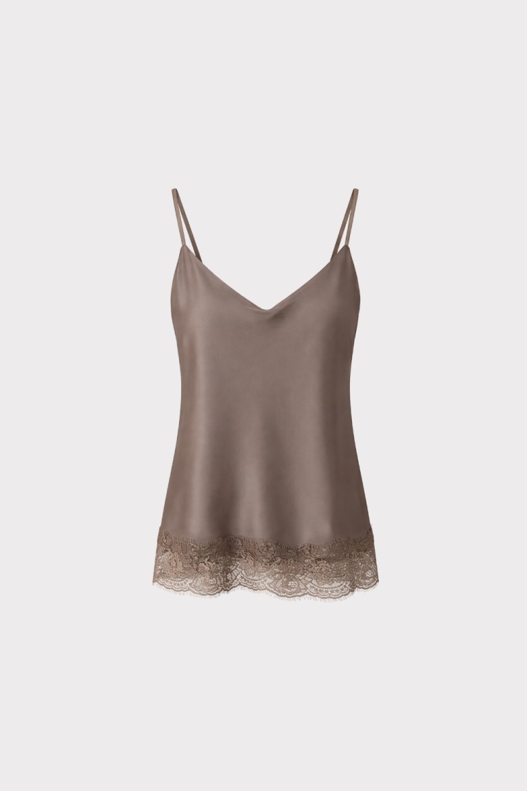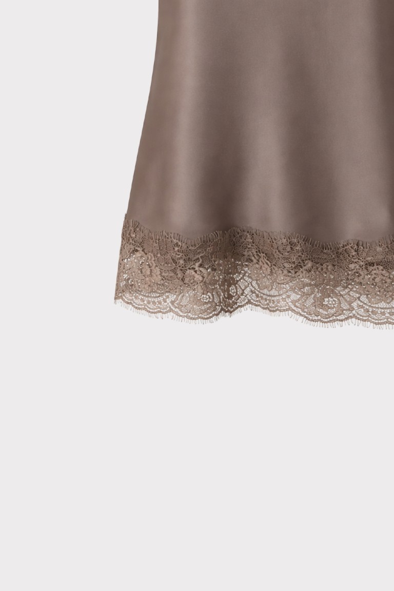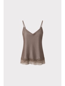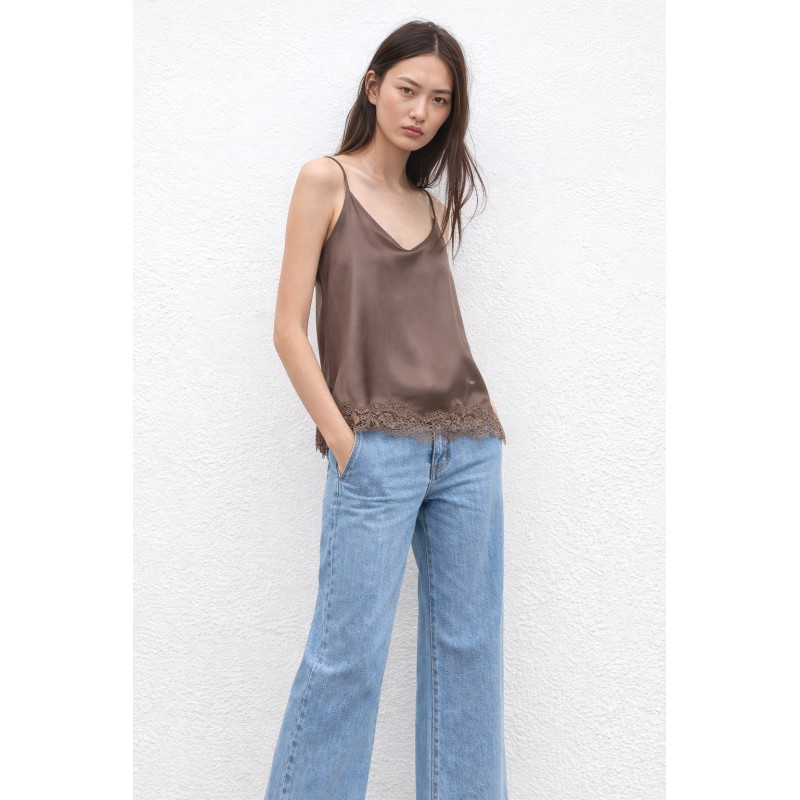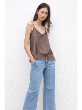 Top in raso fluido dall’effetto satinato, caratterizzato da un design essenziale impreziosito da pizzo raffinato applicato al fondo, dettaglio che dona femminilità e ricercatezza al capo. Un modello versatile, pensato per accompagnare con naturalezza la silhouette e valorizzare ogni look con discreta eleganza. Lo scollo a V e le spalline sottili conferiscono leggerezza e armonia alle linee, mentre la texture liscia del raso garantisce comfort e una vestibilità fluida. Il pizzo al fondo, delicato ma distintivo, aggiunge un accento sensuale e sofisticato, rendendo il top perfetto sia come capo principale sia come base per outfit stratificati.