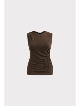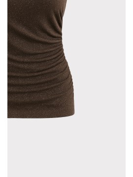 Top in tessuto lurex dalla texture luminosa e raffinata, perfetto per dare un tocco glamour a qualsiasi look. La linea morbida e leggermente drappeggiata valorizza la silhouette senza segnare, offrendo una vestibilità comoda e femminile. Le spalle strutturate e la lucentezza discreta del tessuto rendono questo top ideale sia per outfit da sera che per occasioni speciali. Abbinato a pantaloni eleganti o a una gonna midi, crea un look sofisticato e moderno